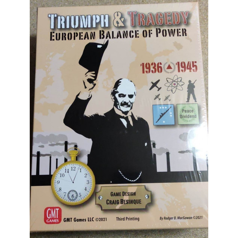 Triumph & Tragedy is a geopolitical strategy game for 3 players (also playable by 2) covering the competition for European supremacy during the period 1936-45 between Capitalism (the West), Communism (the Soviet Union) and Fascism (the Axis). It has diplomatic, economic, technological and military components, and can be won by gaining economic hegemony or technological supremacy (A-bomb), or by vanquishing a rival militarily.