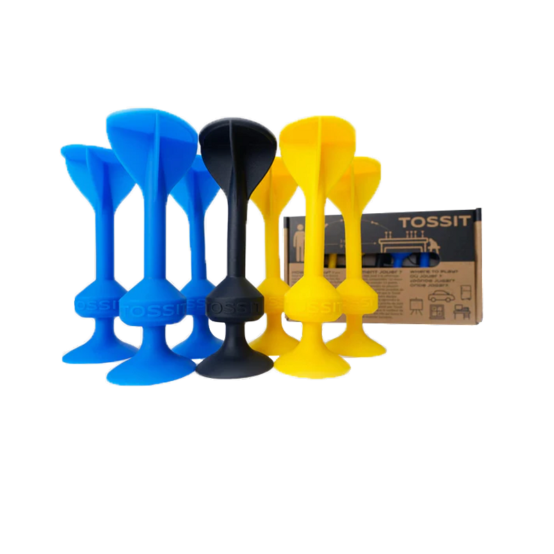 This funny activity game is a variant of Pétanque. Nevertheless as it contains so-called Tossits made of elastic material, it has not only similarities to boule but as well to dart as it can be played on nearly every flat surface: tables, windows and even cars, ...