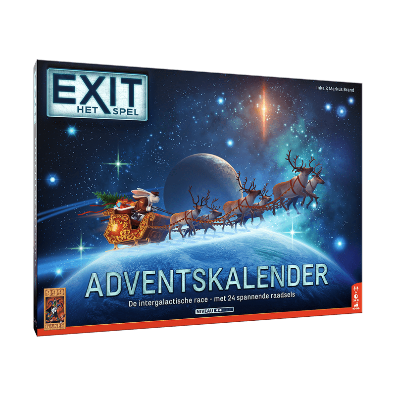 Race door het heelal en verken de uithoeken van de Melkweg met deze speciale adventskalender van EXIT. Geniet samen of alleen 24 dagen lang van een uitdagende puzzel waarin je het ontstaan van het kerstfeest ontdekt. Terwijl je de adventskalender afgaat leidt de oplossing van elke puzzel je naar het juiste vakje voor het verhaal van de volgende dag. Zo sta je elke dag voor een nieuwe verrassing! Kom je er een keer niet uit, dan helpt het spel je graag op weg, zodat iedereen van deze doos vol avontuur kan genieten!