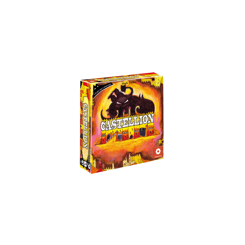 Castellion is a tile-laying game in which you form parts of the castle for defense against monsters. Each turn you flip over a tile and either use its special ability or place it as part of your castle. The more towers and keeps you form, the better your defense against attacks. Ranks prevent traitorous tiles from affecting you fully. When all three monsters have attacked and you still have a base of six tiles, you win.