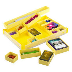 Each box comes equipped with 15 removable trays in five distinct sizes: eight small trays, two double trays, two 'Mini-American' trays, two standard-sized card trays, and one extra-long tray measuring a generous 30cm. Both the Standard and Mini-American card trays can accommodate 75 single-sleeved or 40 double-sleeved cards. The lid easily snaps off and can be placed on top of the trays during gameplay. With this storage solution, all your tokens for any game are always within reach!