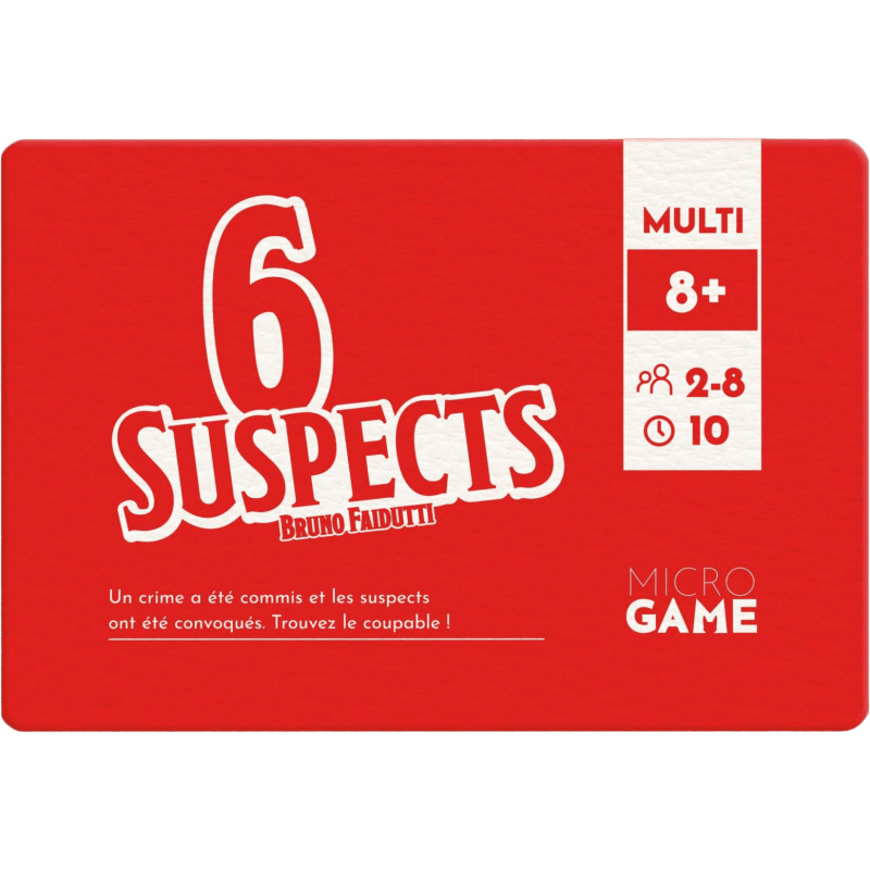 6 suspects is a game of memory and logical deduction. A crime has been committed. Two hidden evidence cards are assigned to each one of the six suspects. Players look at evidence cards, one after the other, trying to be the first to find the culprit.