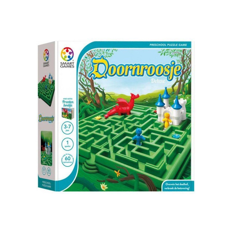 Kan jij de ridder helpen om zonder te verdwalen het kasteel van Doornroosje te bereiken? Of help je liever de prinses om de uitgang van de doolhof te vinden? Het wordt extra uitdagend, want door de 4 verschillende delen van het spelbord onstaat er telkens een nieuwe doolhof. Of misschien speel je liever als de draak? Dan wordt het spel net omgekeerd. Probeer dan het puzzelstuk met de draak op de juiste plaats te zetten zodat hij alle wegen naar het kasteel blokkeert en de ridder niet meer tot bij de slapende prinses kan komen.