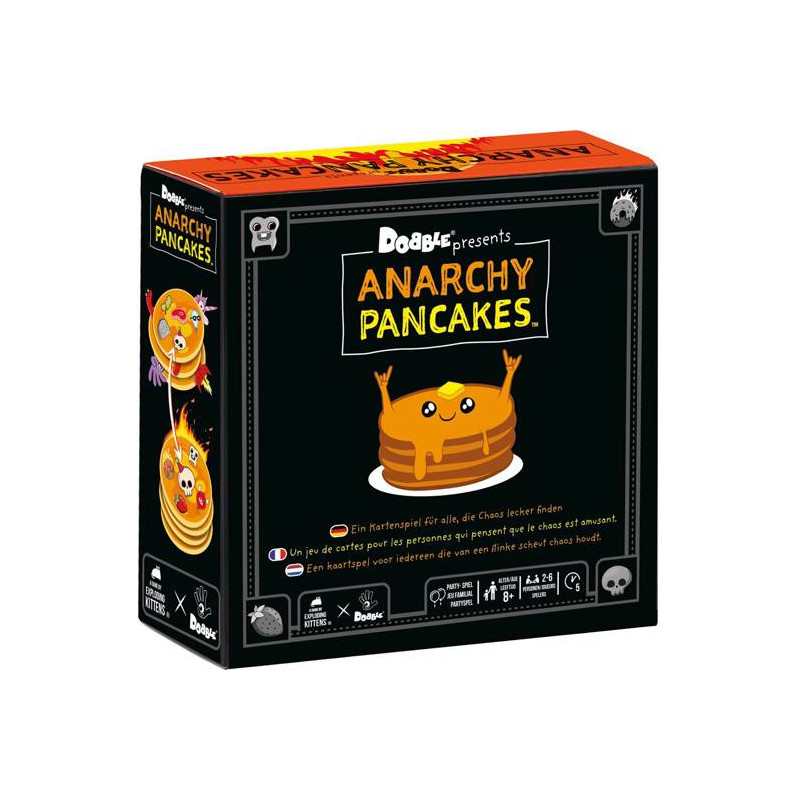Dobble Anarchy Pancakes Kaartspel Iedereen krijgt een aantal pannenkoekkaarten met allerlei vreemde toppings erop. Match jouw toppings met die van andere spelers om hen te dwingen jouw pannenkoeken te nemen.