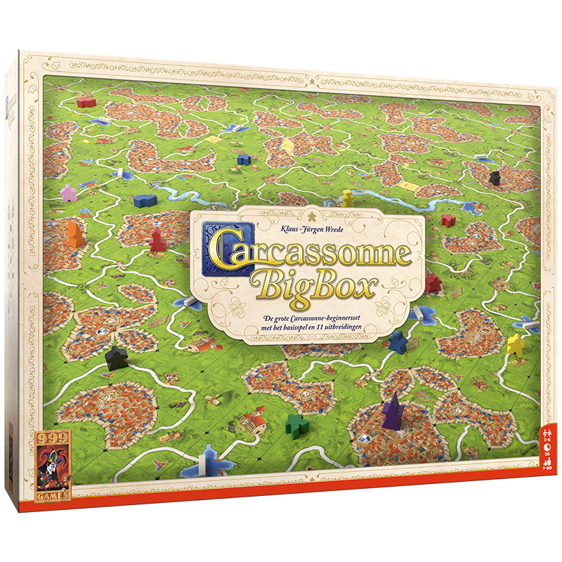 The sixth edition of the Carcassonne Big Box contains the Carcassonne base game, the Inns & Cathedrals and Traders & Builders expansions, the mini-expansions The River and The Abbot now included with the base game, and the six mini-expansions from 2012: Carcassonne: The Flying Machines, Carcassonne: The Messengers, Carcassonne: The Ferries, Carcassonne: The Gold Mines, Carcassonne: Mage & Witch, and Carcassonne: The Robbers; these six each include one of the six tiles for the Carcassonne: The Corn Circles II/Crop Circles II mini expansion.
