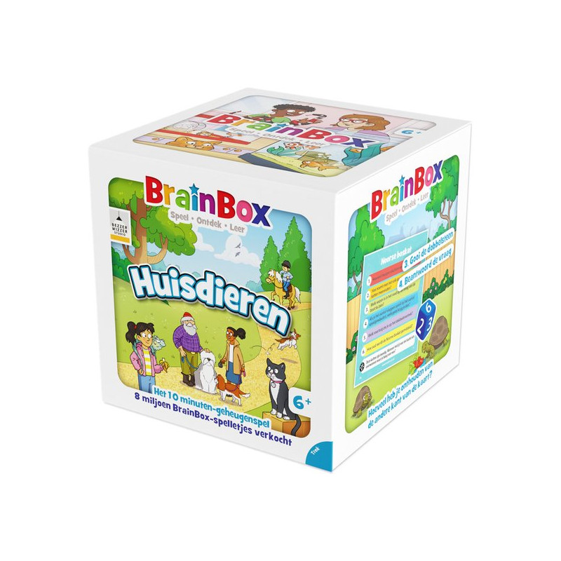 BrainBox Huisdieren is een vrolijk en leerzaam kaartspel waarin kinderen hun geheugen en observatievermogen testen aan de hand van kleurrijke kaarten vol huisdieren. Van katten tot kikkers en van knaagdieren tot papegaaien: elk kaartje zit boordevol leuke feitjes en details. Spelers krijgen 10 seconden om een kaart te bekijken en moeten daarna vragen beantwoorden over wat ze zich herinneren.