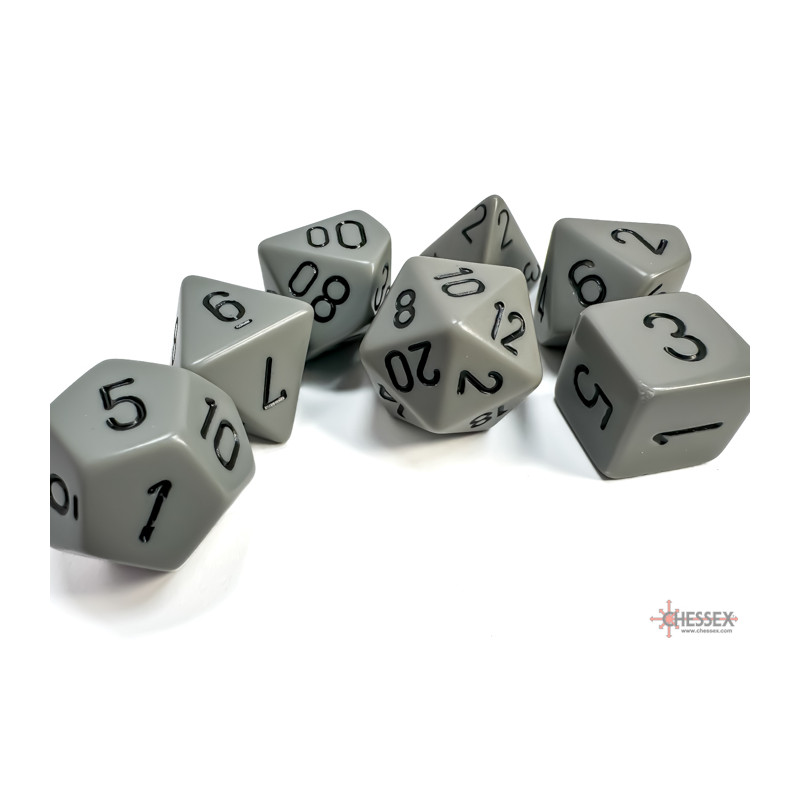 This set contains 7 Opaque Dark Grey dice with black numbers with the following shapes: