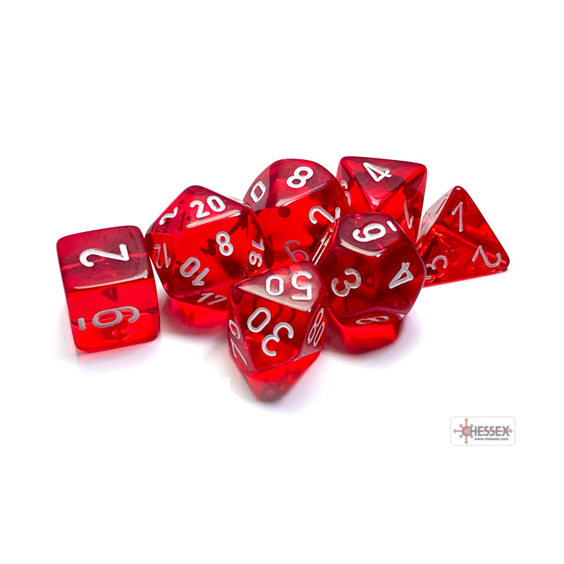 This set contains 7 Translucent Red dice with white numbers with the following shapes: