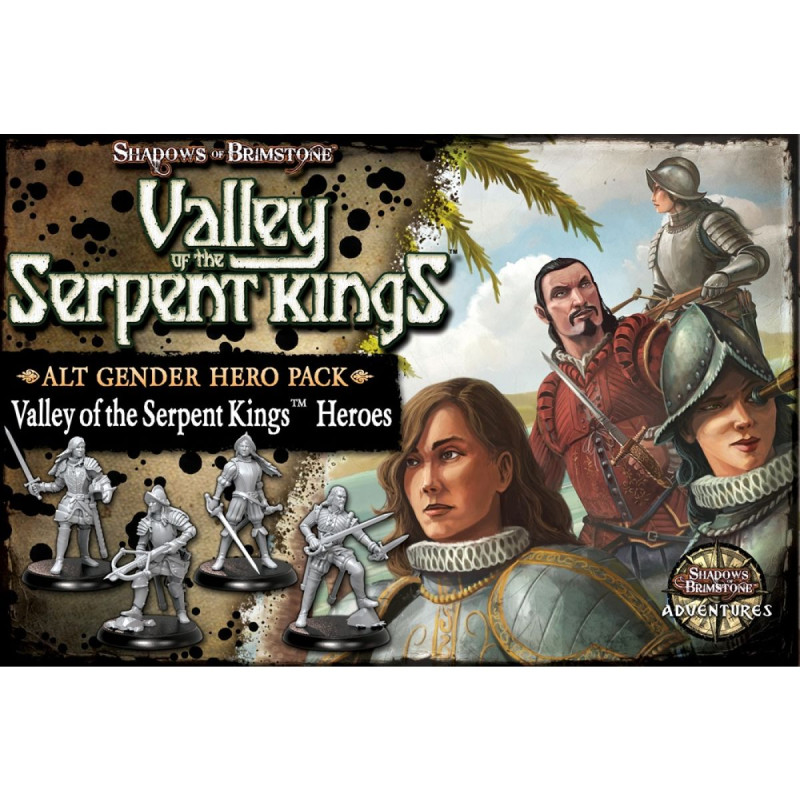 This Alt Gender Hero Pack contains everything you need to add these four Spanish Explorer Team Heroes to your games of Shadows of Brimstone. Included are the Miniatures for the Alternate Gender versions of the Conquistador Heroes originally found in the Valley of the Serpent Kings Adventure Set - El Capitan, Explorer, Duelist, and Soldier, as well as all of the cards, Team Abilities, Hero Character Sheets, Conquistador Upgrade Chart, and counters needed to play as these Heroes.