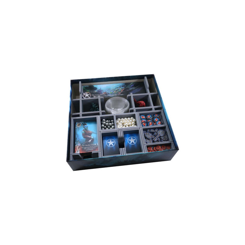 Insert compatible with Abyss®, and the Leviathan® and Kraken® expansions. The design provides both efficient storage and improved game play. Many of the trays can be utilised during the game, and they greatly aid set-up and clear-away times. The rules and boards act as a lid on top of the trays.