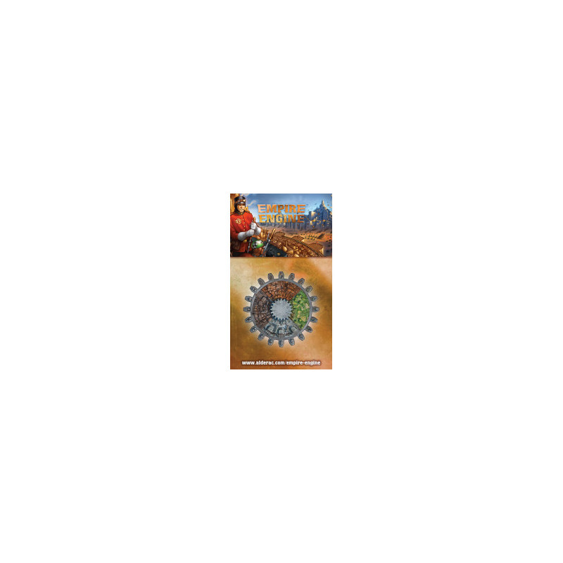 In Empire Engine, players take on the role of a mighty empire, powered by rotating gears. During the game, players simultaneously choose actions to attack, defend, salvage, export, or collect resources (goods for export, soldiers to attack your opponents and inventions to score points). Players use their gears to rotate their engines, and in each round perform the actions on the top edges of their engines. The player who scores the most points for the goods, soldiers and inventions in their score pile at the end of the game is the winner!