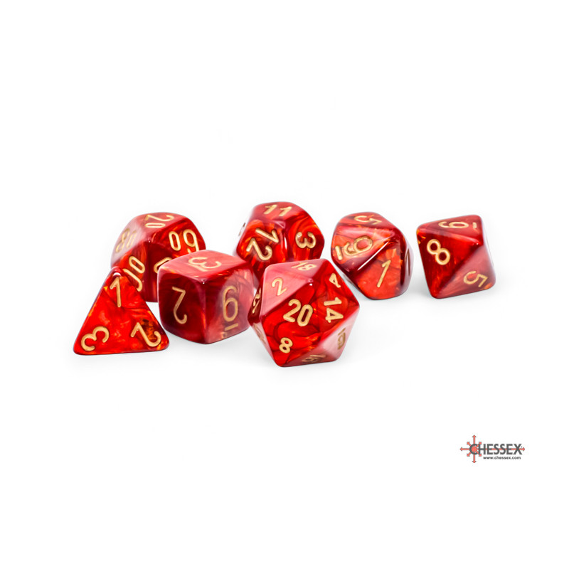 Contains 7 Scarab Scarlet Dice with gold numbers in the following Shapes: