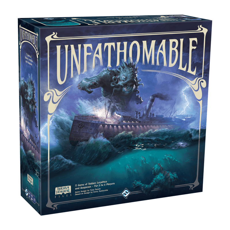 Lurking within the depths of the Atlantic Ocean are a swarm of vicious, unspeakable horrors: the Deep Ones, led by Mother Hydra and Father Dagon. For reasons unknown, they have set their sights on the Atlantica, and their minions, taking the form of human-Deep One hybrids, have infiltrated the steamship to help sink it from within. Each game of Unfathomable has one or more players assuming the role of one of these hybrids, and how well they can secretly sabotage the efforts of the other players might mean the difference between a successful voyage and a sunken ship.