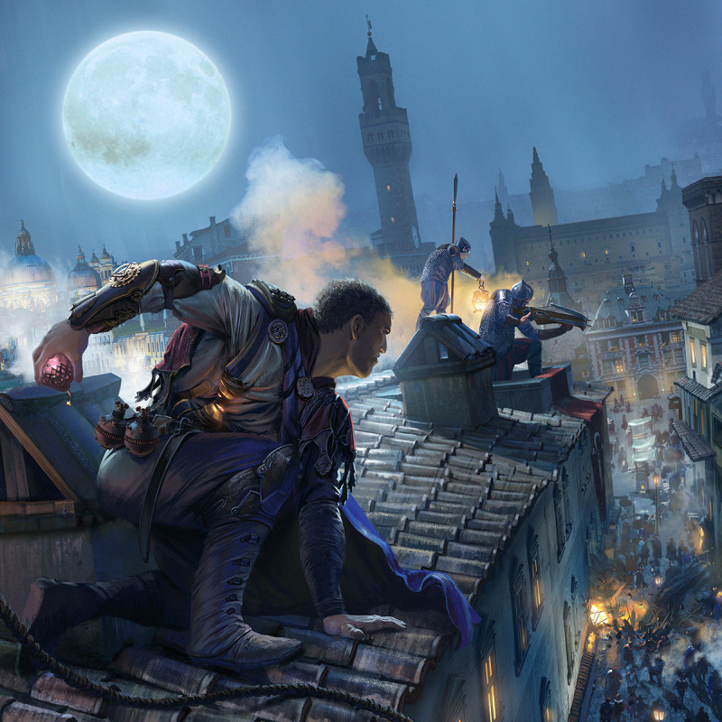 Age of Thieves is a fantasy board game of strategy and adventure set in Hadria, a port metropolis located on the northern fringes of a mighty Empire. Each player becomes a master thief about to commit the most daring burglary of his career. During the game players may use unique abilities of their thieves as well as various action cards, which represent maneuvers, alchemical potions or complicated devices inspired by visionary ideas of Renaissance inventors. The players choose cards to play and then use available Action Points to plan the order of their activities. This makes the game very dynamic, with each resolved action dramatically influencing the turn. The players’ order changes dynamically depending on the number of Action Points placed on each chosen card.