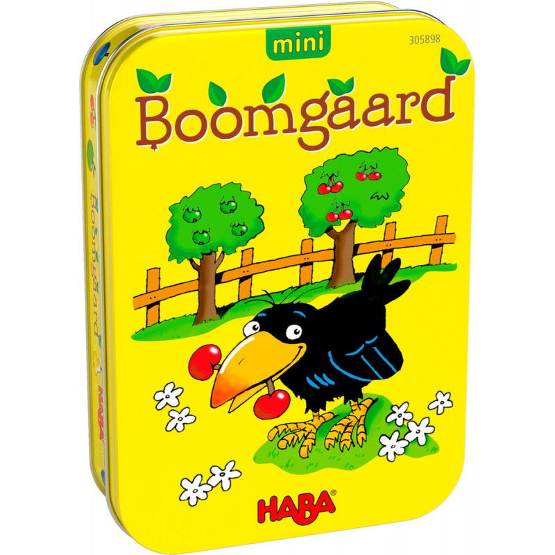 Coöperatief spel Boomgaard mini is de mini versie van de wereldwijd populaire Haba klassieker. Ideaal voor onderweg. In de boomgaard hangen de sappigste kersen, appels, pruimen en peren. Maar iemand wil ze stelen: raaf Theo is in aantocht! Nu hebben de spelers wat geluk met de dobbelstenen nodig. Samen proberen ze het fruit te oogsten voordat de gulzige raaf de boomgaard bereikt.