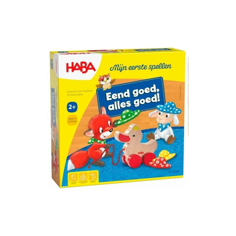 Het is chaos in de kinderkamer, want de knuffeldieren zijn hun favoriete hoed kwijt! Eend Lu gaat de knuffels helpen de hoeden terug te vinden. Draai de hoeden een voor een om, en pas ze op het hoofd van eend Lu. In de coöperatieve spelvariant zoeken jullie samen zes hoeden, voordat de sterrenkaartjes zijn omgedraaid. Als jullie tegen elkaar spelen, dan moet je proberen als eerste alle hoedjes op jouw kaartje te vinden. Vergelijk de hoeden goed. Klopt de kleur en het patroon? Dan is de hoed van een van jouw knuffels en mag je hem houden. Een leuk memoryspel waarbij kinderen spelenderwijs leren over vormen en kleuren. Het spelelement van eend Lu is bovendien een miniatuur-versie van de klassieke trekeend van HABA. Kortom, een perfect cadeau voor jonge spelletjesfanaten!