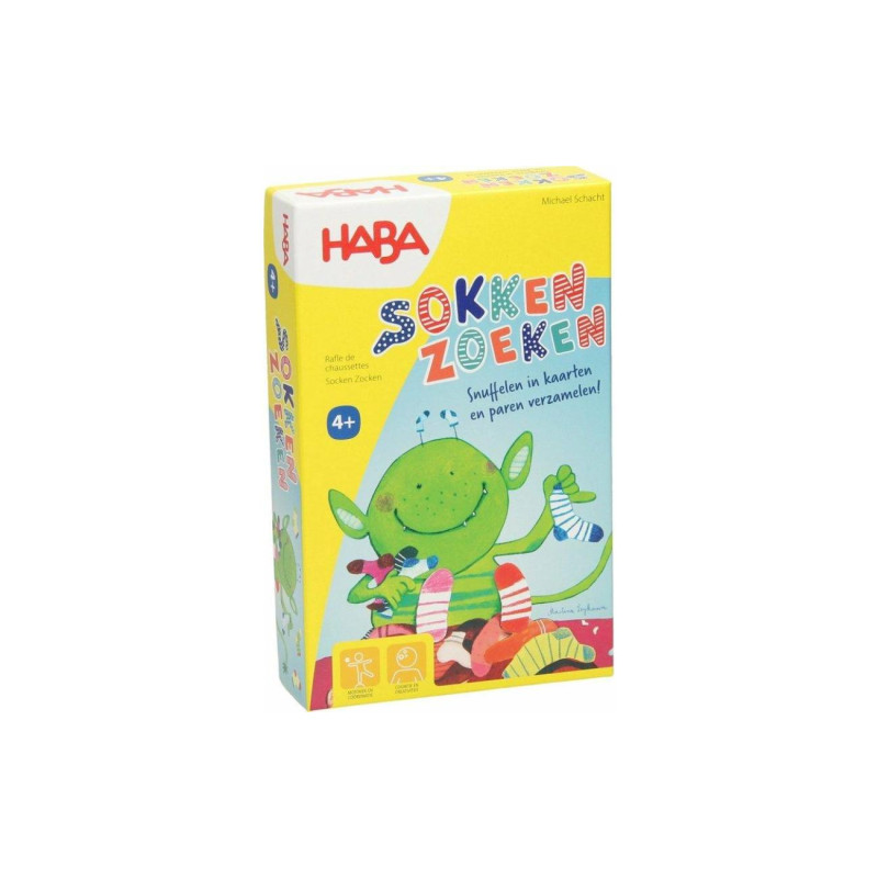 Het sokkenmonster heeft de sokkenla overhoop gehaald, kun jij alle paren weer bij elkaar zoeken? In dit chaotische zoekspelletje spelen alle spelers tegelijkertijd. Strooi de sokkenkaartjes uit over de tafel en zodra het spel start, moet je zo snel mogelijk bij elkaar passende sokken zoeken. Maar let op, want de sokken lijken erg op elkaar, dus dat is nog lang niet zo gemakkelijk. Je moet bovendien erg snel zijn, voordat iemand anders de sokken voor je neus weg trekt. Een grappig, chaotisch, maar vooral erg leuk spel, voor kinderen vanaf 4 jaar, maar geschikt voor de hele familie!