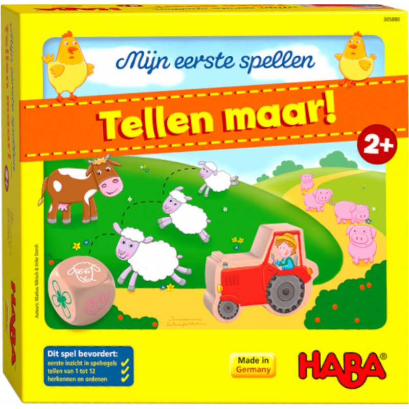 Voer samen met boer Tim zijn lieve dieren en leer meteen tellen! De dieren van boer Tim springen met zijn allen in het rond, waardoor hij totaal geen overzicht meer heeft. Rol de dobbelsteen en beweeg boer Tim in zijn trekker vooruit. Kom je op een klaverblad terecht, dan heb je geluk, want dan mag je de dieren een blad voeren. Wie het laatste klaverblad weet te voeren, wint het spel. Met dit spel leren kinderen spelenderwijs tot 12 tellen, en net als de andere spellen uit de 'Mijn eerste spellen' serie is dit een goed spel om kinderen voor het eerst kennis te laten maken met spelregels, op de beurt wachten en andere sociale aspecten die bij het spelen van een spel aan bod komen. Een leuk spel, goed voor uren speelplezier!