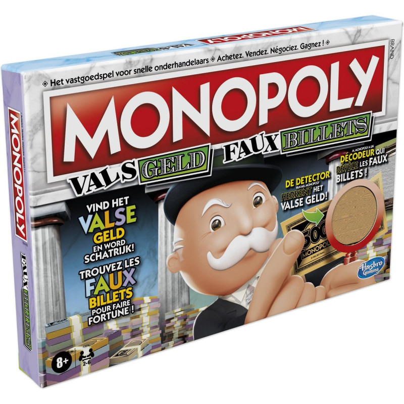 In het Monopoly Vals Geld-spel zijn dingen niet altijd wat ze lijken. Iemand heeft vals geld en valse Kanskaarten toegevoegd! Gelukkig stelt Mr. Monopoly zijn detector ter beschikking om echt van vals te onderscheiden en toch nog een fortuin op te bouwen. Het is een spannend spel met verborgen onthullingen waarin spelers hun tegenstanders met beschuldigingsmunten het vuur aan de schenen leggen voor het gebruik van vals geld of valse kaarten. Gebruik je munten verstandig! Je krijgt er maar een paar. Met Monopoly-pionnen die aansluiten bij het thema ‘bedrog’.