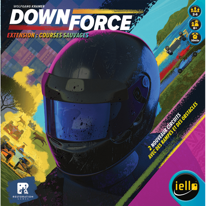 Downforce: Wild Ride, an expansion for Downforce, consists of two new tracks on a double-sided game board, along with 3D ramps and wild animals to be used on the new tracks: