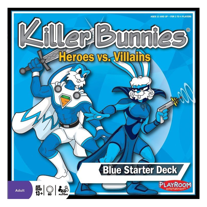 Killer Bunnies: Heroes vs. Villains - Blue Starter Deck is a standalone game in the Killer Bunnies universe. Drawing and playing cards from a shared deck, players may choose to be a defender of goodness, courageousness and virtue by playing the Hero Super Bunnies or a generator of chaos, evilness and deceit by playing the Villain Super Bunnies. Whoever they are, the players use their bunnies’ powers to build cities, attack opponents, and protect themselves. The first player who has a predetermined number of bunnies in the Bunny Circle and cities in the City Circle wins!