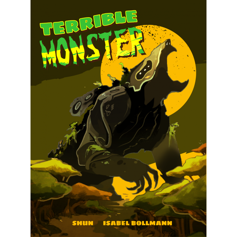 Terrible Monster is a battle card game for two players. Each player starts with four lives, two counter tokens, and a hand of five cards from the deck of 16 cards, with players taking turns to draw a card and play up to two cards against each other, possibly countering or re-countering them.