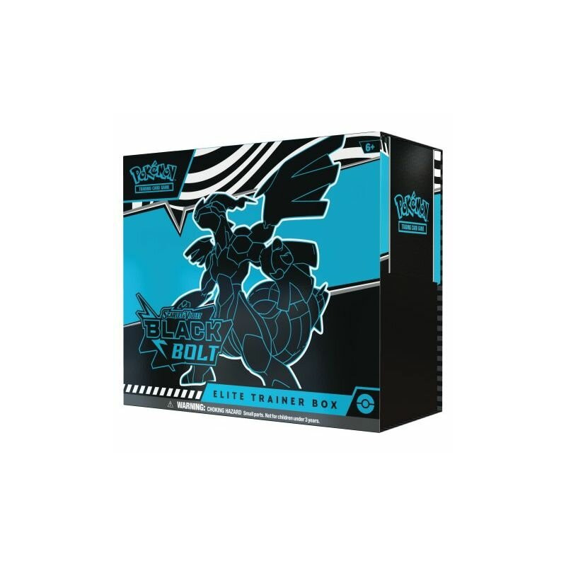 Elite Trainer Box met 9 Scarlet & Violet – Black Bolt booster packs, foil promo Thundurus kaart, 65 sleeves, dobbelstenen en meer accessoires voor spelers en verzamelaars.